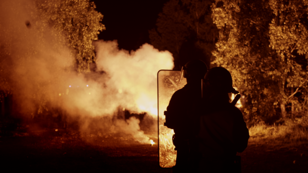 Un centre-ville la nuit. Des cris dans un appartement. Un groupe de trois policiers force la porte et fait irruption dans la pièce. Un homme est maîtrisé, menotté, interpellé. En sortant, la patrouille se retrouve dans une rue en lino bordée par les décors de devantures de commerces et d’un faux commissariat. Sur le site de simulation de l’école de police de Oissel, les élèves gardiens de la paix s’entraînent dans une ville recréée de toutes pièces. Par ses mises en scène de situations de la vie ordinaire, la police y révèle sa vision de l’ordre social.